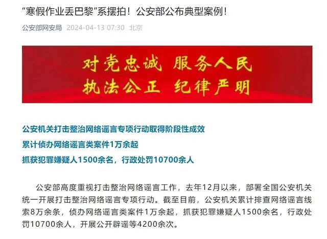 4月13日,公安部公布10起打击整治网络谣言违法犯罪典型案例,其中第一个便是浙江、江苏公安机关查处“寒假作业丢巴黎”摆拍引流案。