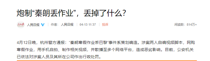 4月12日晚,杭州警方通报:“秦朗寒假作业丢巴黎”事件系策划编造。涉案两人自编视频脚本,网购寒假作业,用手机自拍、制作相关视频,并散播至多个网络平台,造成恶劣影响。目前,公安机关已依法对涉案人员及其所在公司作出行政处罚。