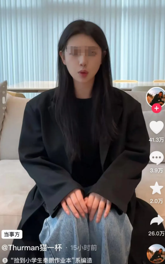 随后,“Thurman猫一杯”在社交平台发布视频并鞠躬致歉:“小学生秦朗巴黎丢寒假作业的视频完全是我编造的,我在这里要给大家道个歉,对此我深感愧疚和抱歉。发布视频,完全是因为我法律意识淡薄,事情后续的发展也超出了我的预期,引起了大量的转发和讨论,扰乱了网络秩序,造成了大量的负面影响,并且还占用了大量的公共资源,污染了网络环境,在此我深刻地反省和道歉。”