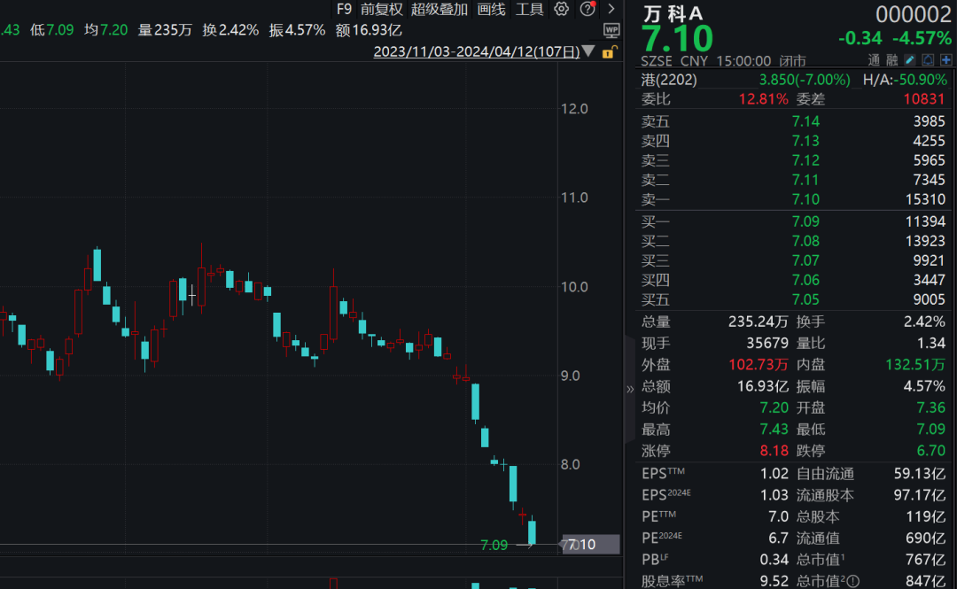 4月以来,因2023年度业绩披露且负面舆情较多,万科股价本月累计跌幅超20%,目前总市值847亿元。