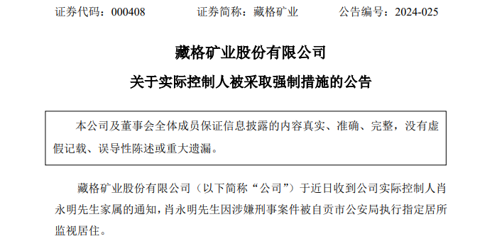 4月16日晚,藏格矿业公告显示,近日收到公司实际控制人肖永明家属的通知,肖永明因涉嫌刑事案件,被自贡市公安局执行指定居所监视居住。