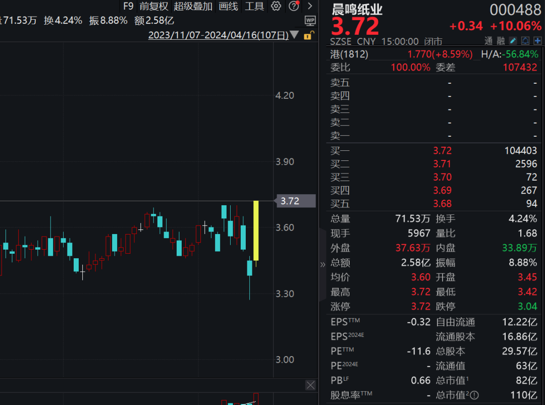 4月16日,造纸龙头晨鸣纸业(000488)股价早盘即报出涨停,当日收涨10.06%,为近三个月高点。