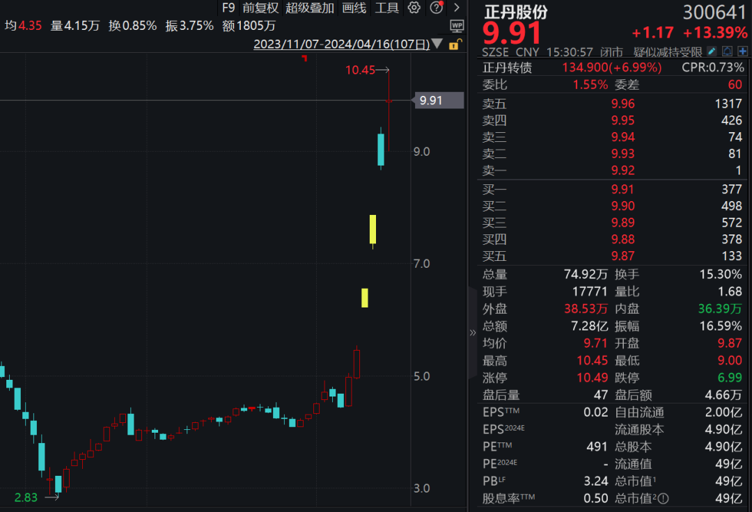 4月15日晚间披露2024年一季度净利润预计至多同比增长465.17%后,主营特种精细化工的正丹股份(300641),今天股价大涨13.39%。而自4月9日以来,该公司股价最大涨幅已达135%。