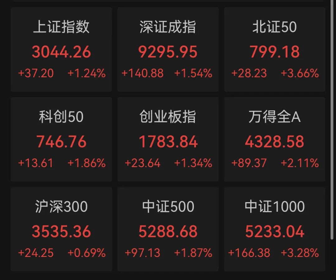 今日早盘,A股全线大幅反弹,中证1000指数大涨逾3%,其他主要股指也均涨超1%,两市超4900只个股飘红,其中逾400股涨停或涨超10%。