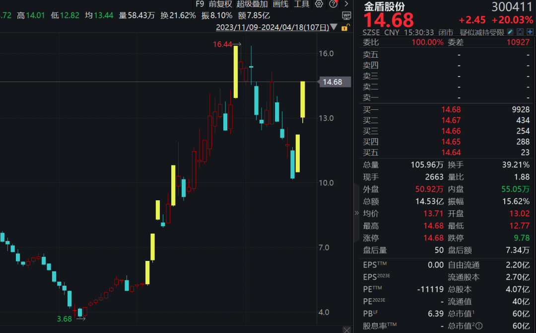热点方面,低空经济今日高开高走,板块指数一度涨逾5%。金盾股份连续第2日20%涨停,安达维尔、交控科技亦20cm涨停,苏交科、岭南控股、设计总院等涨停或涨超10%。