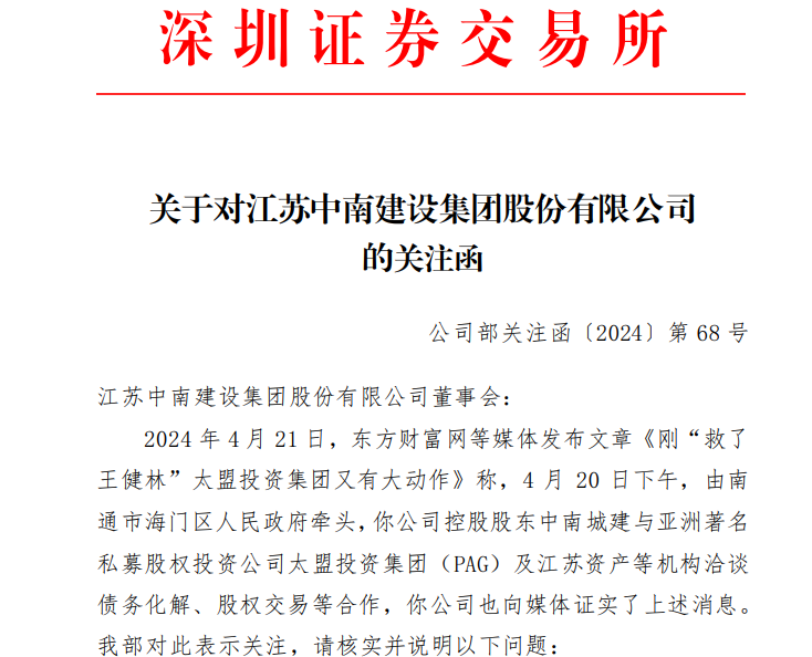 对此,深交所4月22日对中南建设下发关注函,直指有媒体发布文章《刚“救了王健林”太盟投资集团又有大动作》称,4月20日下午,由南通市海门区政府牵头,公司控股股东中南城建与亚洲著名私募股权投资公司太盟投资集团(PAG)及江苏资产等机构洽谈债务化解、股权交易等合作,公司也向媒体证实了上述消息。