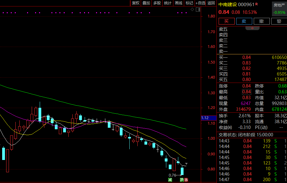 值得注意的是,受“白衣骑士”消息刺激,4月22日中南建设开盘封死涨停,全日成交8339.52万元,收盘报0.84元/股,最新市值32.14亿元。