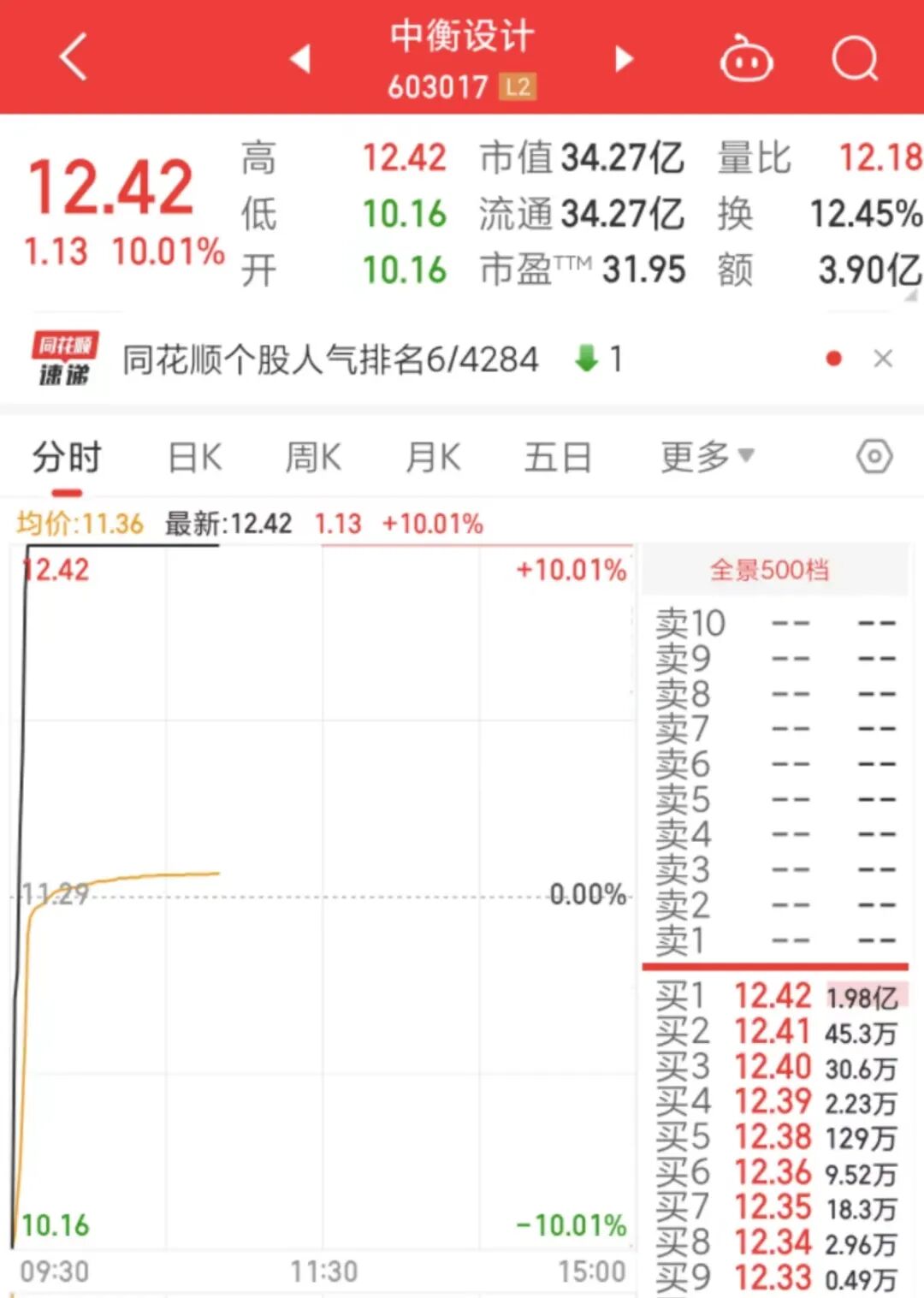 今日早盘,五连板大牛股中衡设计(603017)以跌停价开盘,但开盘后迅速拉升,9:35已拉至涨停。这是该股连续第六个交易日涨停。