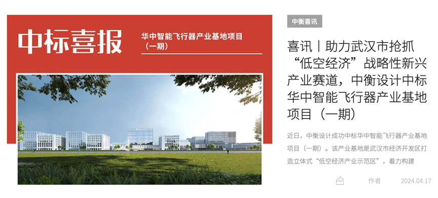 4月17日,中衡设计官网宣布,中标华中智能飞行器产业基地项目(一期)。中衡设计介绍,华中智能飞行器产业基地项目一期规划用地面积75878.55平方米。该产业基地是武汉市经济开发区打造立体式“低空经济产业示范区”,着力构建“3335”现代产业体系重要一环,推动经济高质量发展。