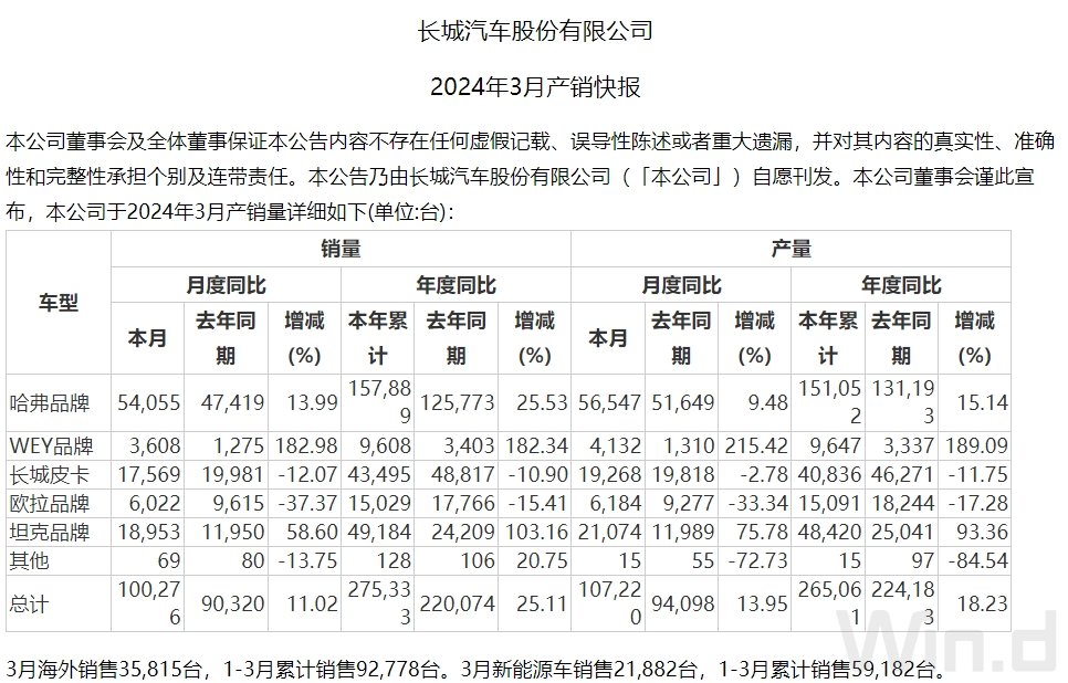 实际上,受益于整车销量和出口业务的增长,长城汽车一季度业绩大增此前市场曾有征兆。4月1日晚间,长城汽车发布3月销量数据。长城汽车3月销售新车100276辆,同比增长11.02%;新能源车销售21882辆,同比增长66.34%;海外销售35815辆,同比增长60.66%,创历史新高。