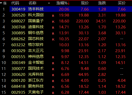 量子科技、证券板块今日领涨。同花顺数据显示,量子科技板块今日涨幅超过7%,浩丰科技、科大国创、天和防务等三股20%涨停,吉大正元、神州信息等10%涨停。信安世纪、国盾量子、迪普科技等十余只个股涨幅超过10%。