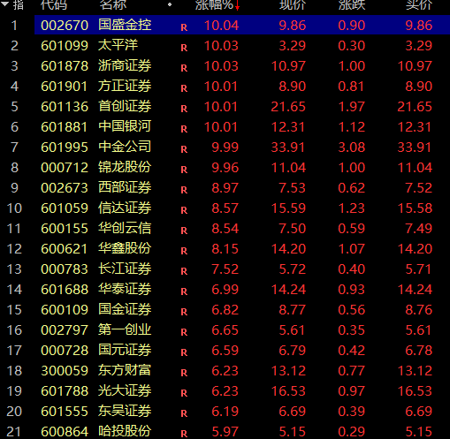 券商板块今日现涨停潮。国盛金控、太平洋、浙商证券、方正证券、首创证券、中国银河、中金公司等券商股涨停;西部证券、信达证券、长江证券等大涨。
