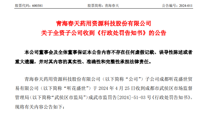 4月26日晚间,青海春天发布一纸关于全资子公司收到《行政处罚告知书》的公告称,子公司听花盛世因涉嫌虚假宣传收到武侯区市监局下发的《行政处罚通知书》,责令公司立即停止违法宣传行为,并拟对公司处罚款180万元。