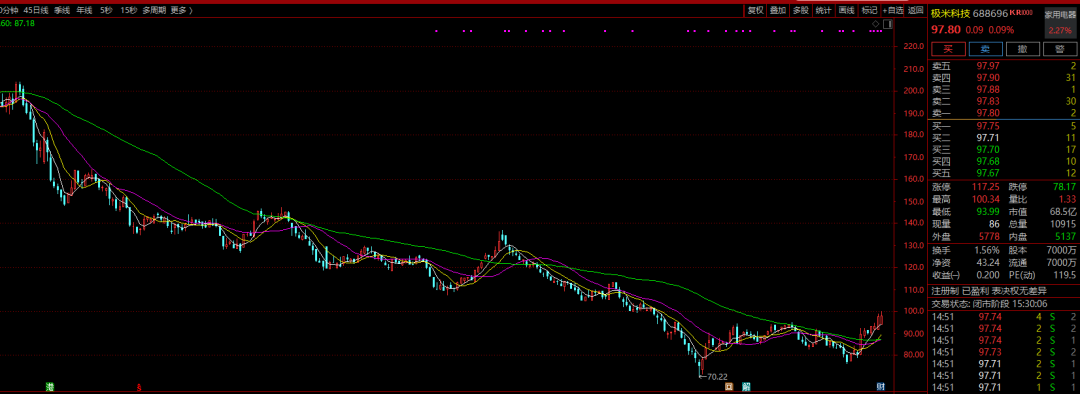 但好景不长,极米科技在短暂达到顶峰之后,股价便快速步入下跌通道之中。截至2024年4月30日收盘时,极米科技股价报收于97.8元/股,较上市之初已经下跌近90%。