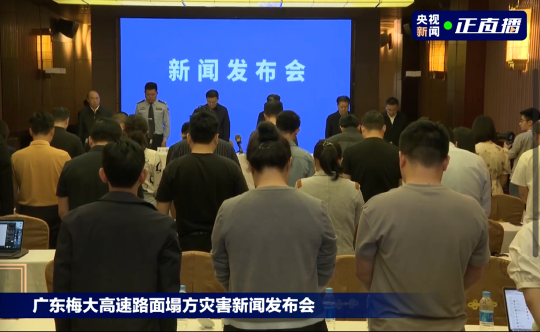 发布会上全体起立向遇难者默哀。