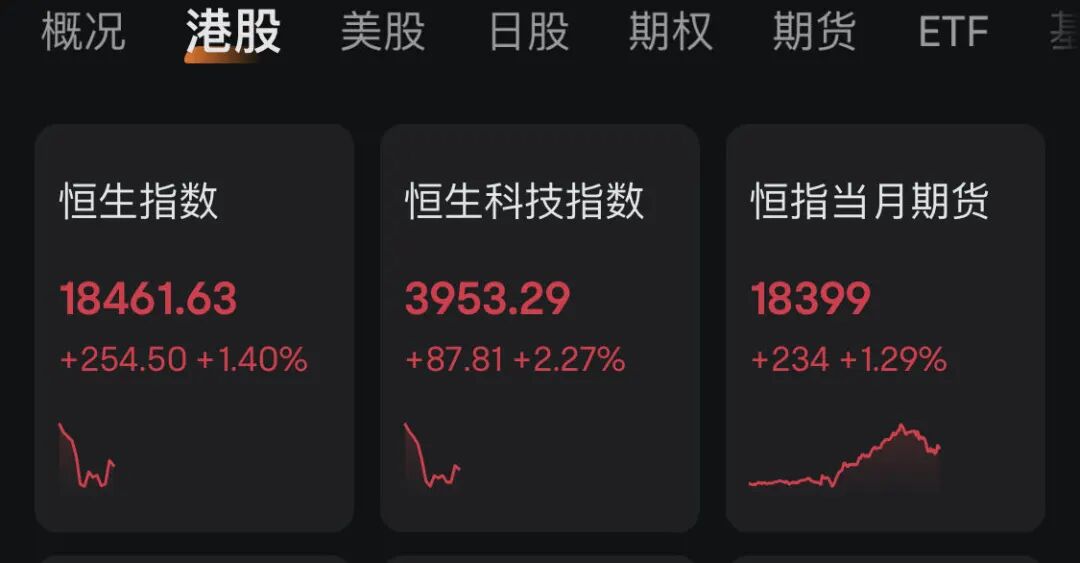 其中,恒指高开1.85%报18543点,国企指数高开2.23%报6580点,恒生科技指数高开3.74%报4009点。