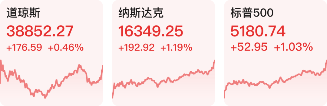 截至收盘,道琼斯指数涨0.46%,纳斯达克指数涨1.19%,标普500指数涨1.03%。