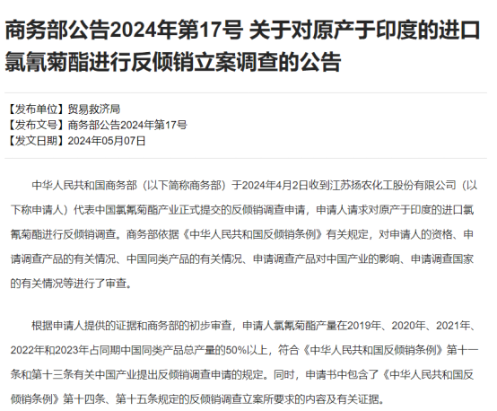 5月7日,国家商务部官网,正式发布《关于对原产于印度的进口氯氰菊酯进行反倾销立案调查的公告》(下称“调查公告”),商务部决定自2024年5月7日起,对原产于印度的进口氯氰菊酯进行反倾销立案调查。