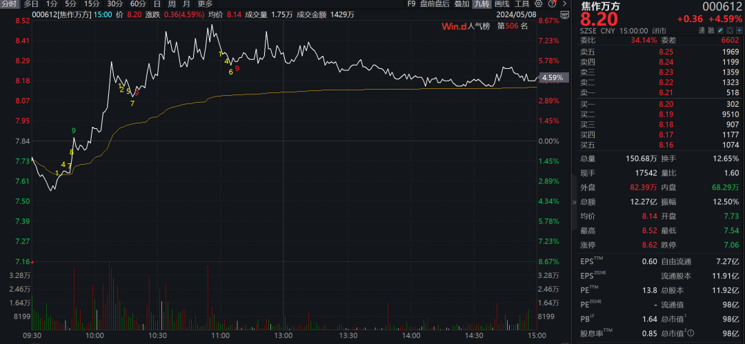 或受此消息提振,5月8日早盘焦作万方股价大涨,午后稍有回落,截至收盘报8.20元/股,涨幅4.59%。