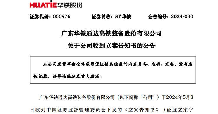 ST华铁也于5月8日收到中国证监会下发的立案告知书,因该公司涉嫌未按时披露年度报告等信息披露违法违规,中国证券监督管理委员会决定对公司立案。ST华铁表示将积极配合调查,并严格按照监管要求履行信息披露义务。