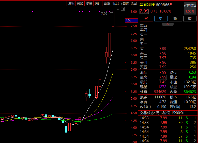 截至5月9日收盘,星湖科技股价报收7.99元/股,最新市值132.8亿元。近4个交易日3天涨停。