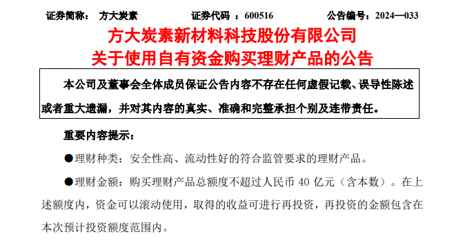 5月10日,方大炭素(600516)发布公告, 公司及控股子公司拟使用自有资金购买安全性高、流动性好的理财产品。自股东大会审议通过之日起12个月内,购买理财产品额度不超过40亿元。
