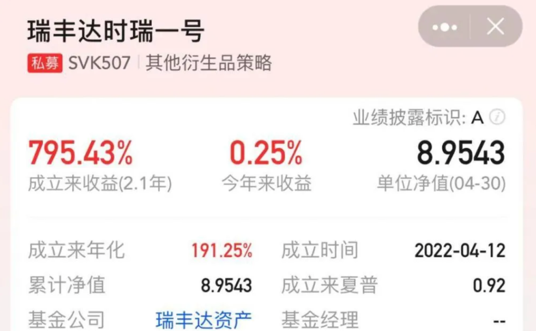私募排排网数据显示,瑞丰达旗下产品业绩相当惊人。其中,截至今年4月30日,成立于2022年4月12日的瑞丰达时瑞一号单位净值8.9543,两年不到收益795.43%,年化收益191.25%,今年1月获得了私募排排网规模20亿—50亿元主观多头产品收益榜冠军。