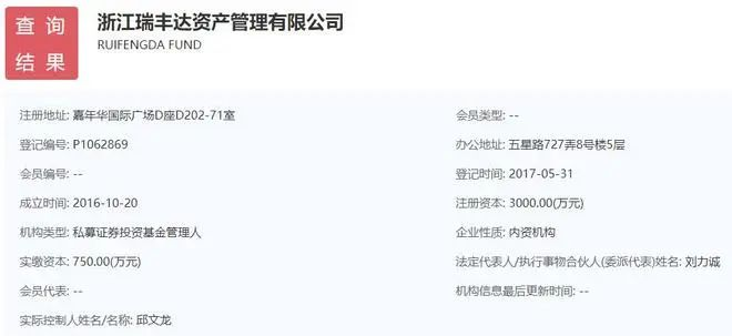 中基协显示,瑞丰达成立时间为2016年10月20日,登记时间为2017年5月31日,实控人为邱文龙,注册地在浙江省湖州市,办公地址在上海市浦东新区,注册资本为3000万元人民币,实缴资本为750万元人民币,共有68只产品在运作。