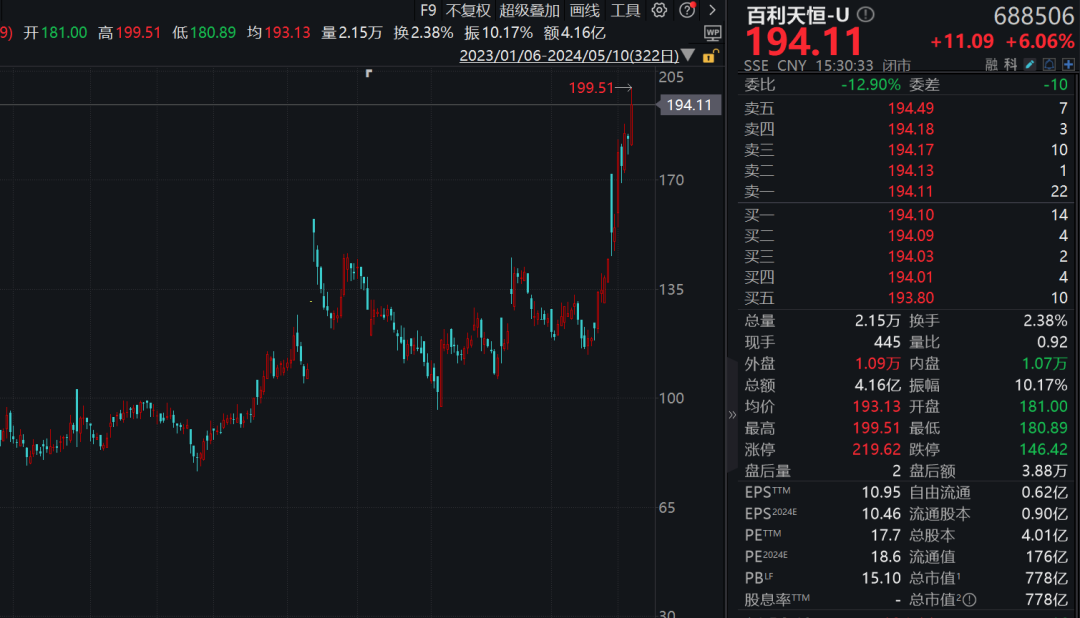 值得一提的是,百利天恒-U本周累计涨超25%,股价创下历史新高,截至5月10日收盘,百利天恒-U上涨6.06%,收盘价为194.11元,收盘价创历史新高。自4月底以来,该公司股价累计涨幅已达55%,最新市值增至778亿元人民币。