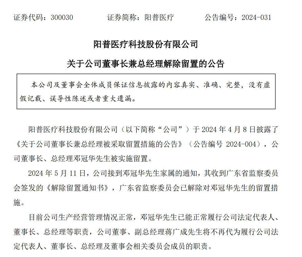 5月12日晚间,阳普医疗公告称,公司接到邓冠华家属的通知,其收到广东省监察委员会签发的《解除留置通知书》,广东省监察委员会已解除对邓冠华先生的留置措施。