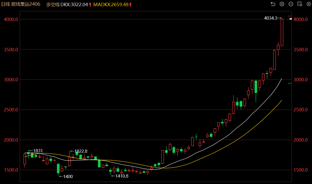 受红海局势持续紧张影响,近期欧线集运期货主力合约连续暴涨,今日再度劲升14.64%,创历史新高,短短2个月,累计上涨逾183%。