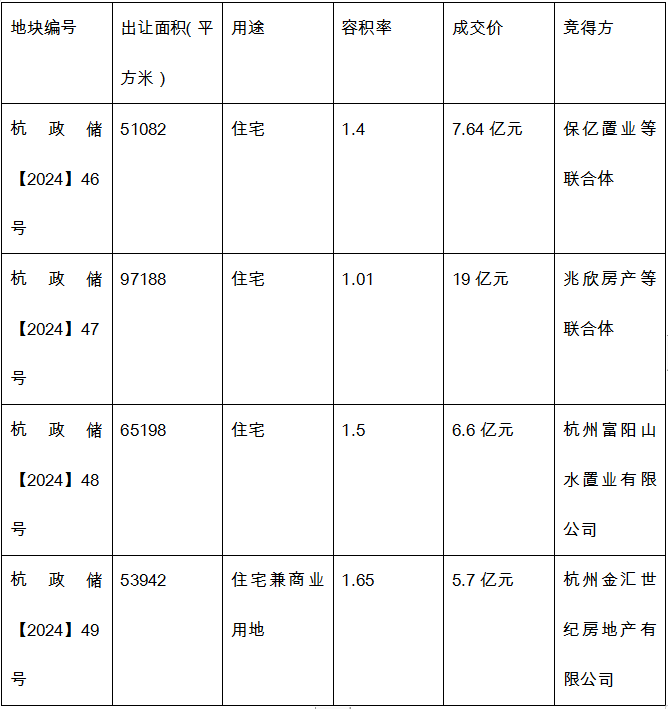杭政储出[2024]48号和杭政储出[2024]49号,均位于距离杭州市中心较远的富阳区。最终,杭州富阳山水置业有限公司以总价6.6亿元,竞得杭政储出[2024]48号地块,楼面价6749元/平方米;杭政储出[2024]49号被杭州金汇世纪房地产有限公司以底价5.7亿拿下该地块,楼面价6404元/平方米。
