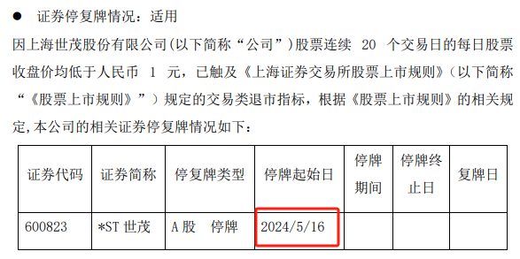 告知书显示,4月12日至5月15日,公司股票连续20个交易日的每日收盘价均低于1元,根据相关规定,公司股票已经触及终止上市条件。上交所将根据相关规定,对公司股票作出终止上市的决定。
