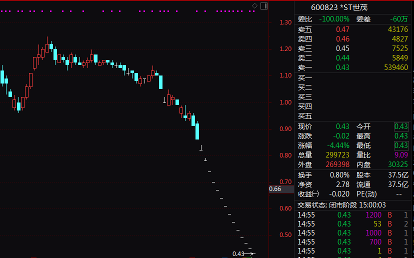 4月5日,中国建设银行(亚洲)股份有限公司于4月5日向香港特别行政区高等法院提出对世茂集团的清盘呈请。4月8日开市后,“世茂系”三家上市公司齐齐大跌,世茂集团大跌逾18%,*ST世茂下跌4.55%触及跌停,世茂服务下跌2.65%。而*ST世茂也正是自此日起开启了一轮连续大幅下跌之路,截至目前跌至0.43元/股。