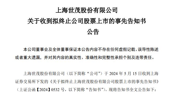 5月15日晚间,*ST世茂(600823)发布公告,公司当日收到上交所下发的《关于拟终止上海世茂股份有限公司股票上市的事先告知书》。