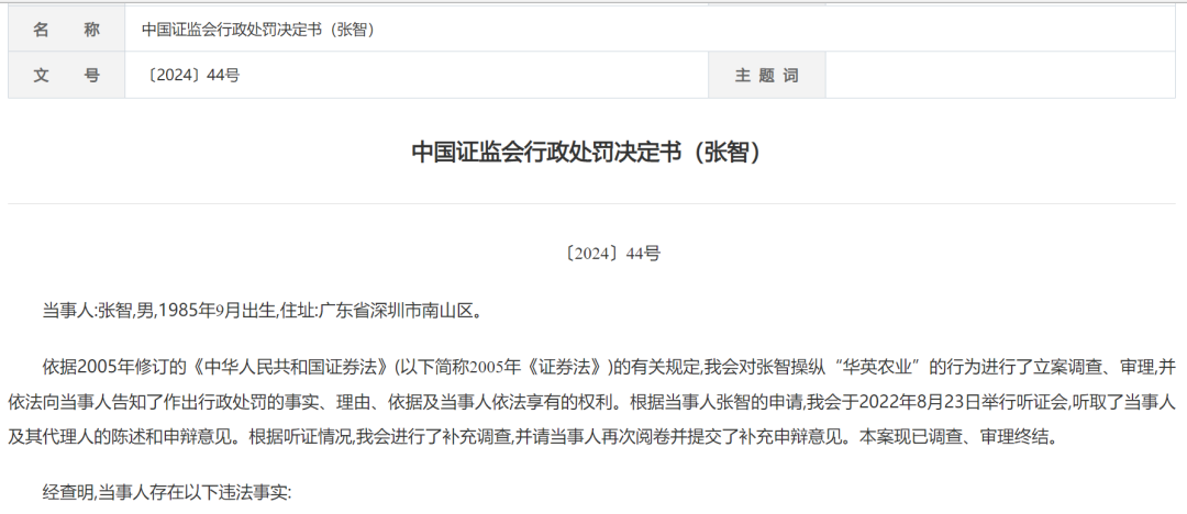 行政处罚决定书还指出,张智存在集中资金优势、持股优势连续买卖,在自己实际控制的账户之间交易,操纵行为影响“华英农业”的交易价格和交易量。