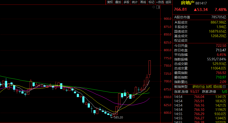 受此影响,午后房地产股展开反攻,板块指数大幅拉升至收盘涨7.41%,创出年内新高,成交猛增至539亿元,创2年多来新高。