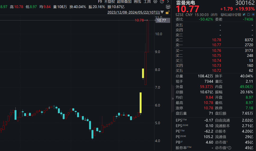 截至5月22日收盘,雷曼光电最近五个交易日已累计上涨超102%、金瑞矿业最近四个交易日累计上涨47%,沃格光电最近五个交易日累计上涨42%,三超新材最近四个交易日累计涨幅超49%。