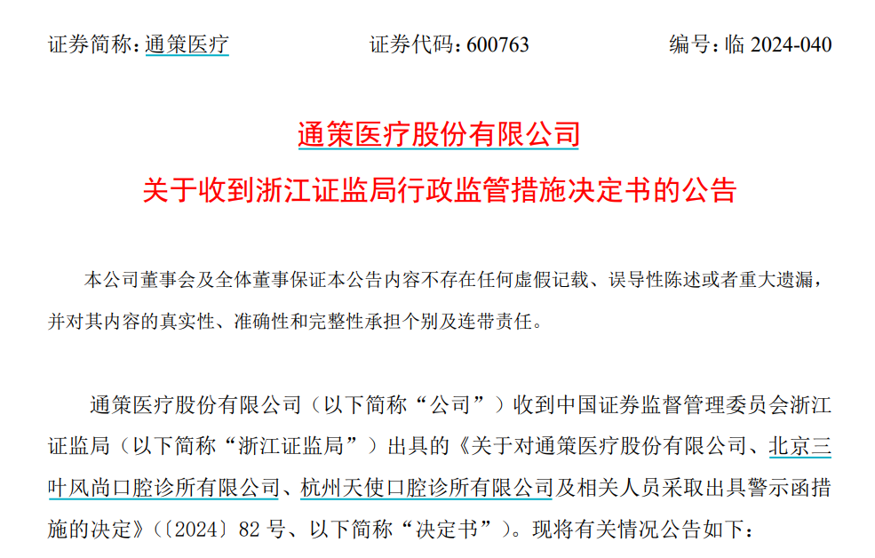 浙江证监局决定对通策医疗、北京三叶风尚口腔诊所有限公司、杭州天使口腔诊所有限公司、吕建明、王毅、徐国喜、张华分别采取出具警示函的监督管理措施,并记入证券期货市场诚信档案。