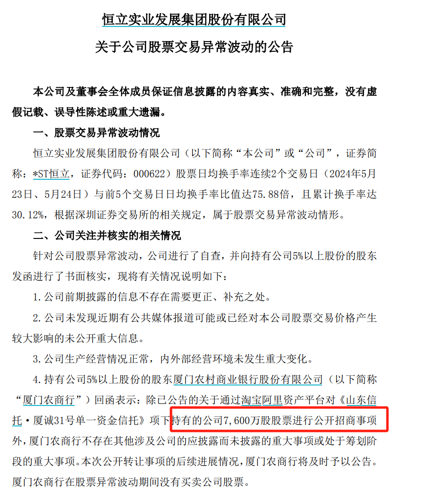 *ST恒立(000622)5月26日晚间披露股票交易异动公告称,公司于5月13日披露了《关于收到公司第一大股东告知函的公告》,公司第一大股东厦门农商行已通过淘宝阿里资产平台对《山东信托·厦诚31号单一资金信托》项下持有的公司7600万股股票进行公开招商。该部分股权占*ST恒立总股本的17.87%。