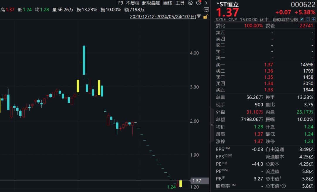 此前,*ST恒立经历过连续13个交易日跌停,创下新低1.24元/股。5月23日开盘,该股跌幅为5.3%,但午后开盘不久迅速冲至涨停,当天报收于1.3元/股,下跌1.52%,全天成交金额9340万元,换手率16.89%。5月24日,股价涨停,达到1.37元,放量成交。