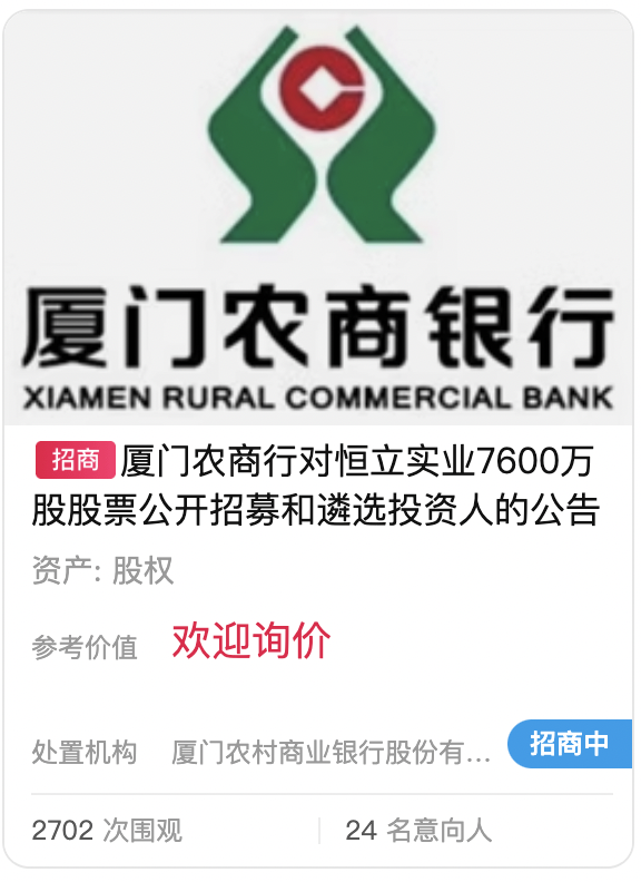 *ST恒立表示,在淘宝阿里资产平台上查阅厦门农商行本次公开招商转让相关公告发现,截至公告日,平台本次公开招商转让事项的公告下显示已有24名意向人。