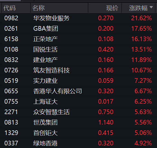 GBA集团早间也一度大涨超31%,近3日累计飙升约85%;正荣地产、国锐生活、筑友智造科技等亦涨超10%。