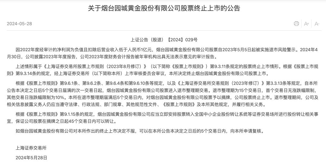 *ST园城方面,因2022年度经审计的净利润为负值且扣除后营业收入低于人民币1亿元,烟台园城黄金股份有限公司股票自2023年5月5日起被实施退市风险警示。2024年4月30日,公司披露2023年年度报告,公司2023年度财务会计报告被年审机构出具无法表示意见的审计报告。