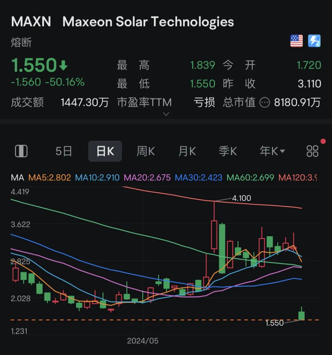 由于一季度收入以及二季度收入前景低于预期,Maxeon股价跌超50%。截至上一个交易日其总市值1.64亿美元,按照盘前交易价格,将再次折半。