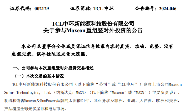 TCL中环基于全球化战略及深化新能源科技创新国际合作的号召,拟通过可转债、定增等一揽子重组交易实现控股Maxeon,作为构建国际能源绿色低碳转型共赢新模式的重要项目。