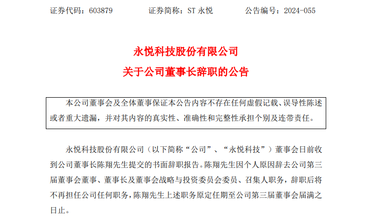 5月30日晚间,ST永悦(603879)发布公告称,董事会日前收到公司董事长陈翔提交的书面辞职报告。