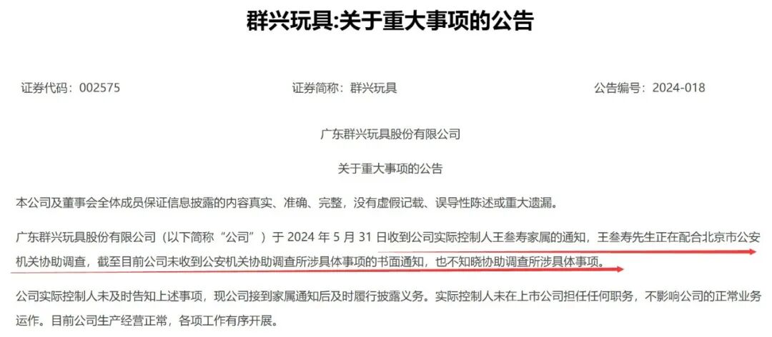 具体而言,6月2日晚,群兴玩具公告,公司于2024年5月31日收到公司实际控制人王叁寿家属的通知,王叁寿正在配合北京市公安机关协助调查,截至目前公司未收到公安机关协助调查所涉具体事项的书面通知,也不知晓协助调查所涉具体事项。