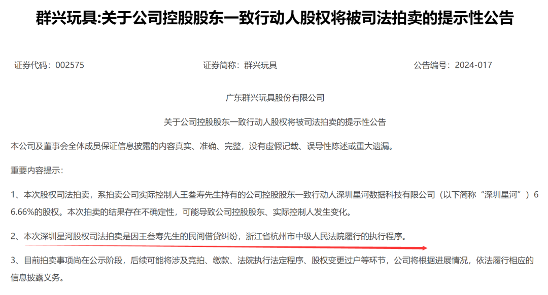 群兴玩具称,该公司近期通过网络查询获悉,浙江省杭州市中级人民法院将于 2024年6月12日10时至6月13日10 时止在杭州市中级人民法院淘宝网司法拍卖网络平台上,对公司实控人王叁寿持有的公司控股股东一致行动人深圳星河 66.66%的股权进行拍卖,起拍价为1.35亿元。