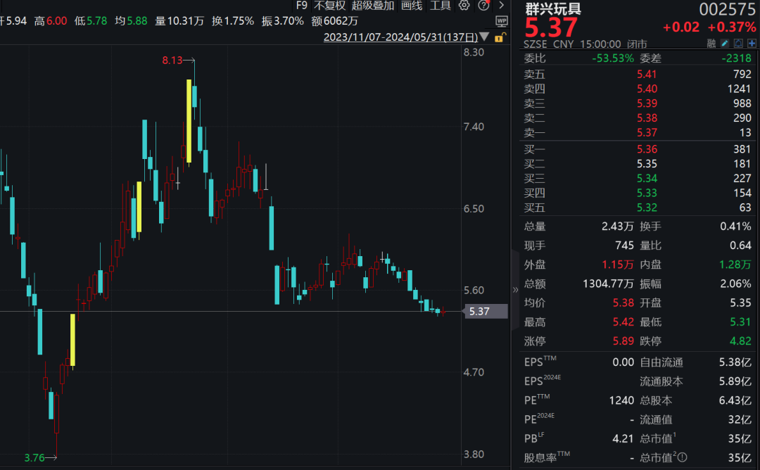 截至6月2日,群兴玩具最新股价5.37元/股,总市值约35亿元。